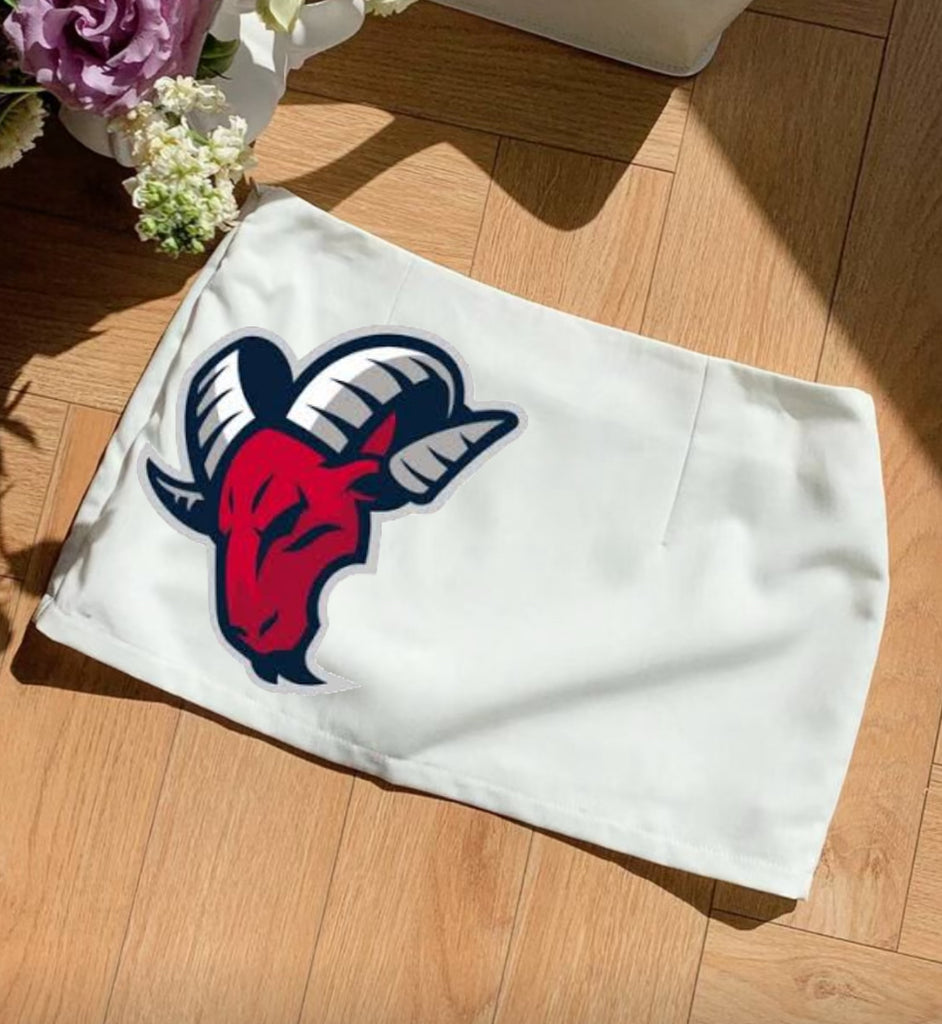The cutest denim mini skirt featuring pocket patches sewn on with your school name and colors!!